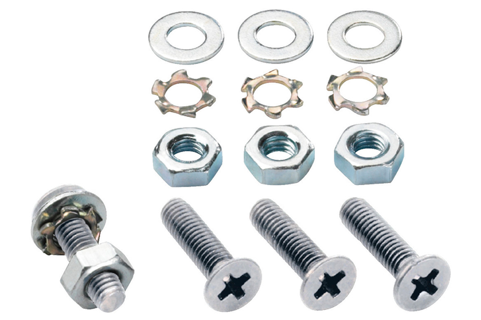 Komplet monteringssæt med 16 skruer, møtrikker og skiver, passer perfekt til RCP-rackpaneler fra Monacor