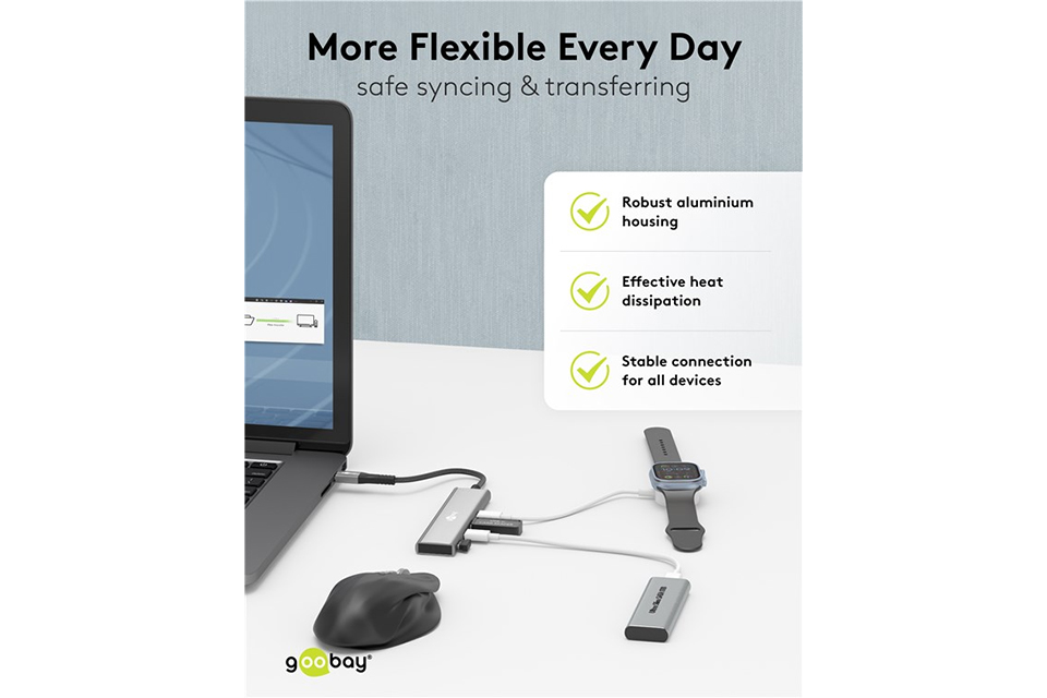 Denne elegante 4-ports USB hub forvandler én enkelt USB-C™ port til fire, så du nemt kan tilslutte tastatur, mus, ekstern harddisk eller smartphone, alt sammen uden behov for at skifte stik. Uanset om du bruger MacBook, iPhone 16, Samsung Galaxy eller en hvilken som helst anden USB-C™ enhed, får du maksimal fleksibilitet og hurtig dataoverførsel med op til 5 Gbit/s. Den perfekte løsning til dig, der arbejder digitalt og ønsker problemfri tilslutning.