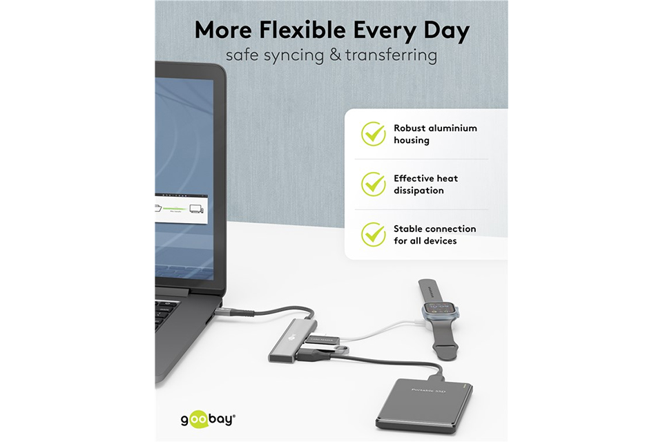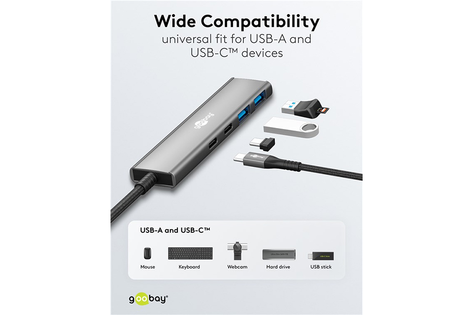 Med denne slanke USB-hub behøver du ikke længere vælge mellem dine enheder. Den forvandler én enkelt USB-C™-port til fire brugbare tilslutninger - to USB-C™ og to USB-A, så du kan forbinde både nyere og ældre enheder på én gang. Hvad end du arbejder med filer, streamer medier eller oplader udstyr, får du maksimal fleksibilitet uden irriterende ombytning af kabler.