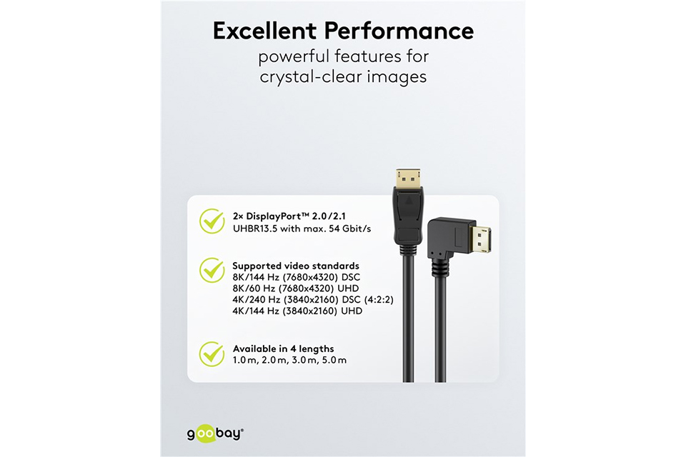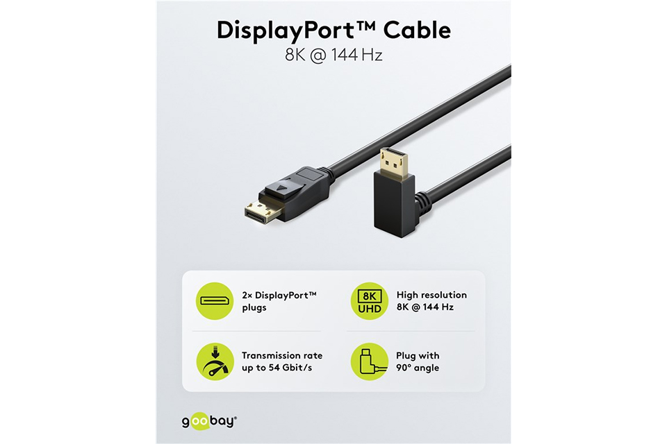 Vinklet DisplayPort 2.1 DP40 kabel (4K@144 Hz / 8K@60 Hz) GB-77056: Vinklet DisplayPort 2.1 DP40 kabel (4K@144 Hz / 8K@60 Hz)