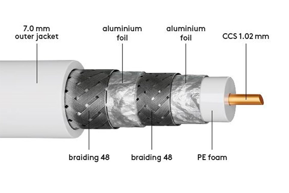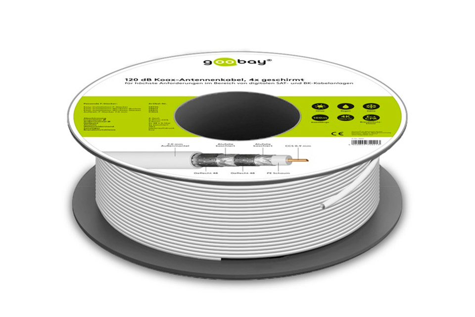 Højdepunkter:• 120 dB skærmet koaksialkabel med 4-lags beskyttelse• Ideel til digitale SAT og DVB-C installationer • Fleksibel PVC kappe modstår varme, kulde og vejr • Metermarkering på kablet for nem installation • Eca brandklasse i henhold til CPR standard Koaksialkabel til digitale installationer:Dette 120 dB SAT koaksialkabel er den perfekte løsning til stabile og højtydende signalforbindelser. Kablet er velegnet til både satellit og kabel-tv systemer, herunder DVB-S/S2, DVB-T/T2 og DVB-C/C2. Den 4-dobbelte skærmning beskytter effektivt mod elektromagnetiske forstyrrelser, hvilket sikrer en fejlfri overførsel af lyd og billede selv over længere afstande. Med metermarkering på kablet bliver installation og tilpasning nemmere, så du altid kan måle præcist, hvor meget kabel du har brug for.Holdbar konstruktion og høj kvalitet:Den fleksible PVC kappe beskytter kablet mod både kulde, varme og vejrforhold, hvilket gør det ideelt til både indendørs og udendørs brug. Den indre leder er fremstillet af CCS, der kombinerer høj ledningsevne med styrke og fleksibilitet. Med en diameter på ca. 7 mm er kablet både robust og nemt at håndtere under installation. Kablet leveres på en praktisk tromle, hvilket gør udrulning og opbevaring mere overskueligt.Specifications:• Kabeltype: Koaksialkabel• Antal skærmninger: 4x (folie og aluminium flet) • Skærmningseffektivitet: 120 dB • Dielektrisk diameter: 4.8 mm • Inderleder diameter: 1.02 mm • Inderleder materiale: CCS • Kabeldiameter: ca. 7 mm • Kabel længde: 100 m • Impedans: 75 Ohm • Yderkappe: PVC, hvid • Metermarkering: Ja • Temperatur område: -20 °C til +70 °C • Brandklasse: Eca (CPR) • Pakningstype: Kabeltromle