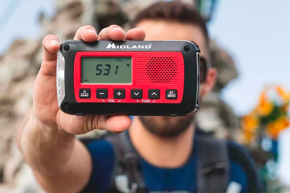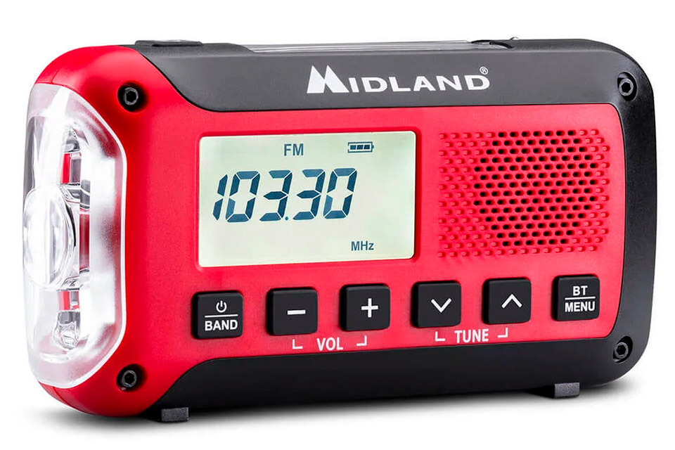 Højdepunkter:• Nødradio med FM/AM og Bluetooth-forbindelse• Opladning via dynamo, solpanel eller USB-kabel • Kraftig Cree LED lommelygte med 130 lumen • Genopladeligt 2600mAh Li-Ion batteri med lang levetid • Baggrundsbelyst LCD display for nem aflæsning • SOS-lygtefunktion med morsekode for nødsituationer • Kan nødlade mobilen til opkald i kritiske situationer Designet til nødsituationer og eventyr:Midland ER250BT er en multifunktionel nødradio skabt til at give tryghed og forbindelse i enhver situation. Med både AM/FM-modtager og Bluetooth kan du holde dig informeret og underholdt, uanset om du befinder dig i naturen, på campingtur eller under strømafbrydelser. Den kraftige Cree LED-lygte på 130 lumen giver et imponerende lys, som kan anvendes både som arbejdslys og som SOS-signal ved hjælp af indbygget morsekode-funktion.Fleksibel strømforsyning og nødladefunktion:Enheden kan oplades på tre måder: via USB-kabel, solpanel eller den indbyggede dynamo, så du altid har strøm, selv langt fra civilisationen. Den robuste 2600mAh Li-Ion batteripakke sikrer lang driftstid, og takket være nødladefunktionen kan du give din mobil nok strøm til at foretage et opkald, selv når batteriet ellers er helt fladt, ideelt i nødsituationer, hvor hvert sekund tæller.Avancerede funktioner og solid konstruktion:Det baggrundsbelyste LCD-display gør det nemt at aflæse frekvenser og status, selv i mørke. Bluetooth-funktionen giver mulighed for trådløs afspilning af lyd fra mobilen, og det kompakte design gør ER250BT nem at have med på tur. Det solide kabinet og det brede temperaturområde fra -20°C til +55°C gør radioen modstandsdygtig over for både kulde og varme, perfekt til udendørs brug året rundt.Specifications:• Frekvensområde: 531-1629KHz (AM) / 87,5-108MHz (FM)• Strømforsyning: 3,7Vdc Li-Ion batteri 2600mAh • Bluetooth-effekt: 6dBm • Lydeffekt: >300mW • Driftstemperatur: -20°C til +55°C • Lydudgang: 3,5 mm stereo • Mål: 150 x 79 x 43 mm (LxHxD) • Vægt (uden batteri): 327 g • Opladningsmetoder: dynamo, USB, solpanel • Lommelygte: Cree LED 130 lumen • SOS-funktion med morsekode • LCD-display med baggrundsbelysning BEMÆRK: Solcelle eller håndsvings-funktionen i powerbanks er tiltænkt som supplement / vedligehold opladning af batteriet. Powerbanken kan IKKE oplades helt udelukkende via solen, og kræver derfor tilslutning til stikkontakt for grundopladning, hvis du ønsker fuldt udbytte af powerbanken. Maksimal strøm via solceller er typisk kun omkring 200 mA i optimale lysforhold og stærk sol, grundet de relativt små solpaneler.