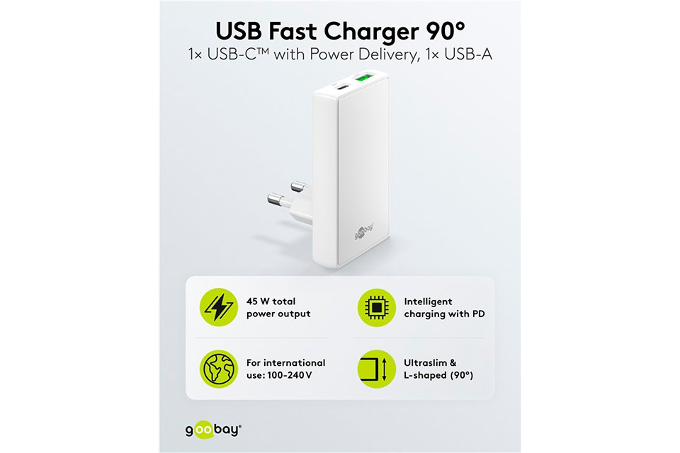Denne smarte USB-C™ PD GaN Dual Fast Charger med 90° fladt design er den perfekte løsning til trange steder, hvor almindelige opladere ikke passer. Med stik på undersiden kan opladeren placeres helt tæt mod væggen, så du undgår kabelrod bag natborde, skabe og sofaer. Opladeren er knap tykkere end en fodliste, hvilket gør den ideel til hjem, kontor eller rejsebrug. Det vinklet design beskytter samtidig kablerne mod knæk og forlænger deres levetid.