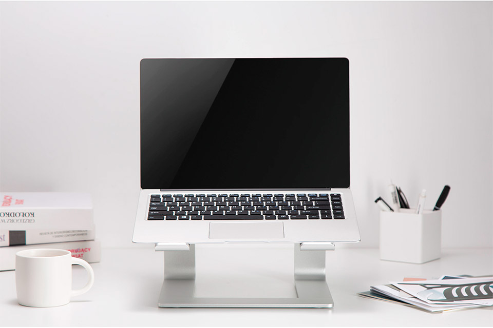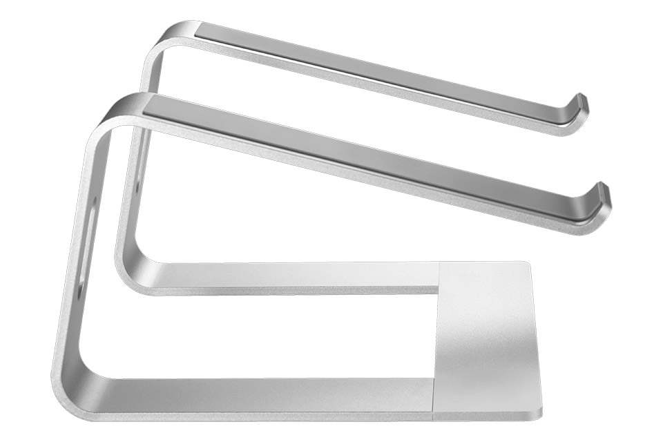 Elegant og let laptopholder i sølv, der hæver din computer til øjenhøjde for en ergonomisk arbejdsstilling med stilrent design og solid aluminiumsbase.