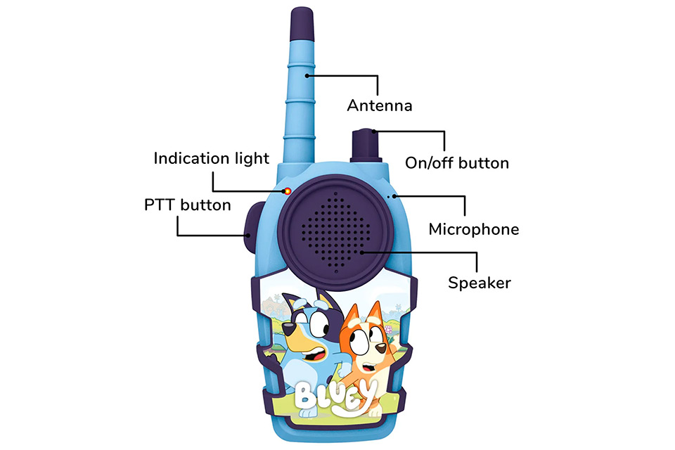 Højdepunkter:• Sjovt Bluey-tema design med figurerne Bluey og Bingo• Krystalklar lyd for tydelig kommunikation • Nem push-to-talk knap perfekt til små hænder • Op til 150 meters rækkevidde • Holdbare og lette til både indendørs og udendørs leg Leg og eventyr med Bluey:Eventyret begynder med Bluey Walkie Talkie-sættet, der bringer fantasifuld leg til live. Med ikoniske motiver af Bluey og Bingo bliver kommunikationen en del af legen, hvor børn kan udforske og skabe deres egne historier. Den enkle push-to-talk-knap gør walkie talkierne lette at betjene, selv for de mindste børn, og den klare lyd sikrer, at beskederne går tydeligt igennem – uanset om legen foregår i stuen, haven eller på legepladsen.Bygget til sjov og bevægelse:Bluey Walkie Talkie-sættet er lavet i et let, men holdbart design, så det tåler masser af leg både indenfor og udenfor. Med en rækkevidde på op til 150 meter kan børnene kommunikere på tværs af huset, haven eller legepladsen uden problemer. Sættet kræver 3 AA-batterier (medfølger ikke), så husk at have dem klar, når legen starter. Perfekt gaveidé til små eventyrere, der elsker Bluey-universet og fantasifulde oplevelser.Specifications:• Rækkevidde: Op til 150 meter• Strømforsyning: 3 x AA-batterier (ikke inkluderet) • Design: Bluey og Bingo-tema • Funktion: Push-to-talk • Lydkvalitet: Krystalklar lyd • Anvendelse: Indendørs og udendørs • Vægt: Let konstruktion for børn • Holdbarhed: Robust plastmateriale