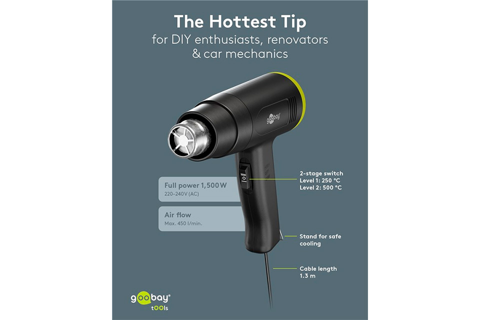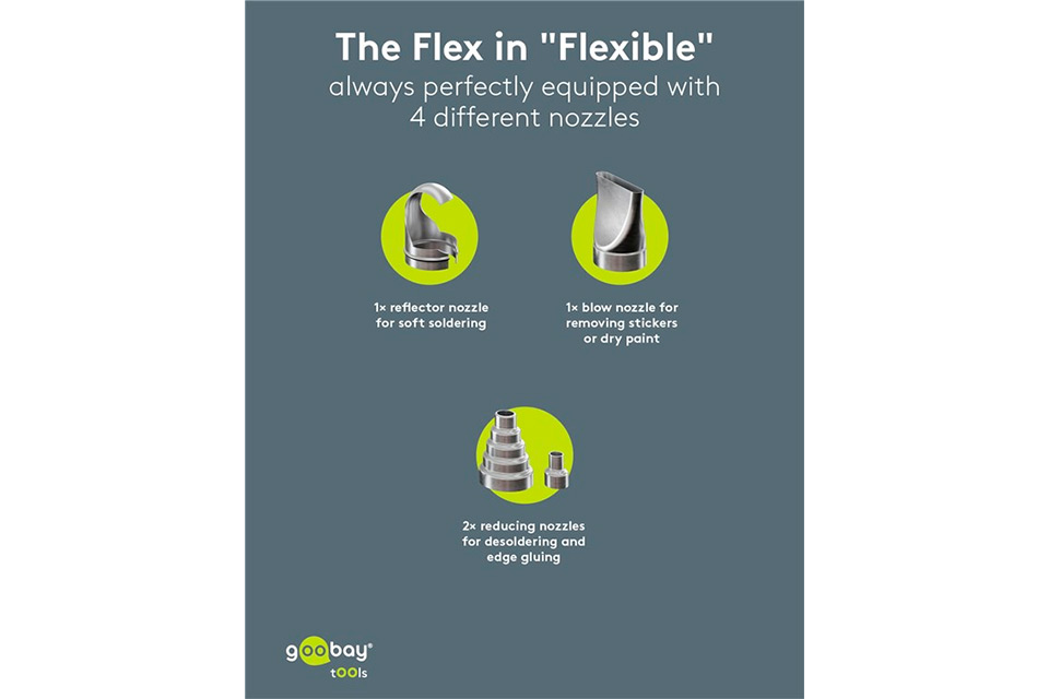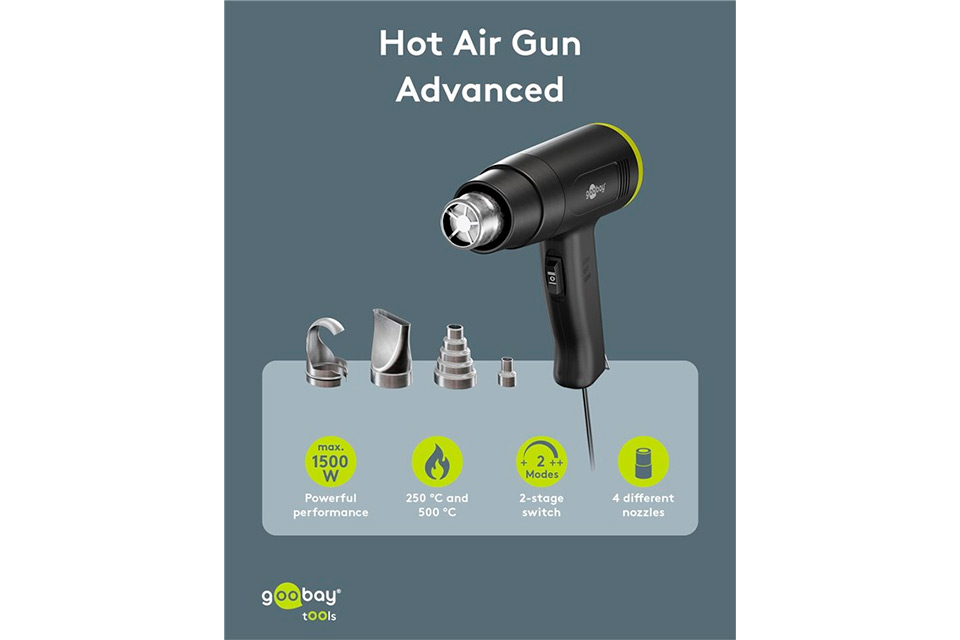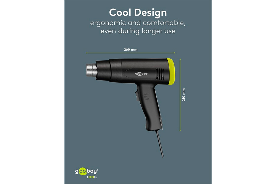 Med fire medfølgende dyser kan du tilpasse varmepistolen til mange forskellige opgaver. Den flade dyse er perfekt til maling og klistermærker, reflektordysen egner sig til blød lodning, og de to smalle dyser gør præcisionsarbejde som aflodning og kantlimning nemt. Uden dyse kan varmepistolen bruges til små tørreopgaver, udglatning af plastoverflader eller reparation af ridser. Det ergonomiske design og den 1,3 meter lange netledning giver optimal bevægelsesfrihed, mens den robuste konstruktion sikrer lang levetid.