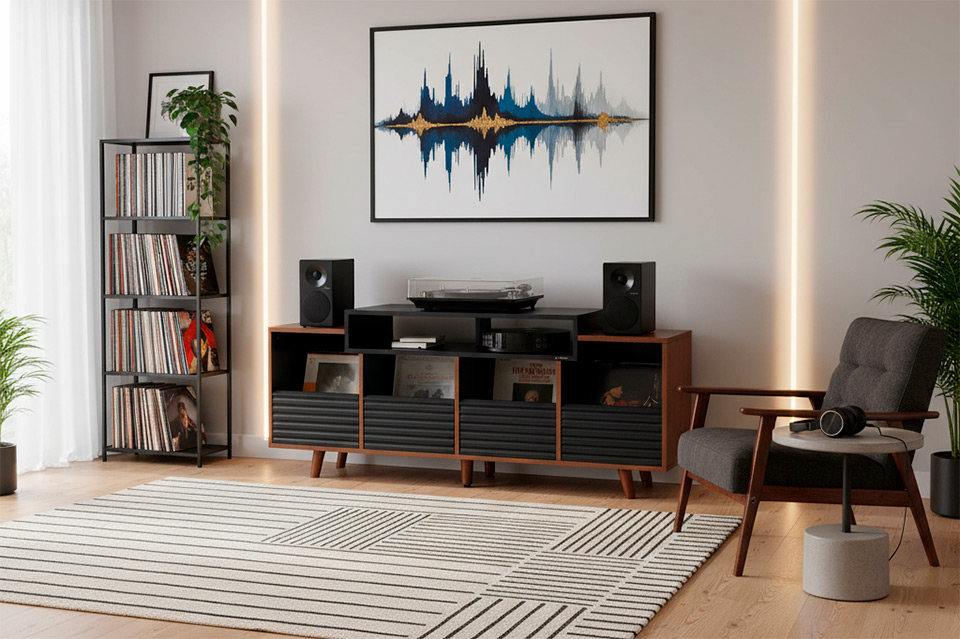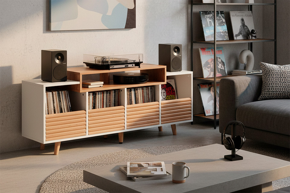 Højdepunkter:• Plads til op til 320 vinylplader• Bred topplade med plads til pladespiller og bogreolshøjttalere • Robust konstruktion i melamin • Elegant design til moderne og klassiske hjem • Stort centralt udstyrsrum på 84 cm • Høj bæreevne i både topplade og skuffer • Leveres fladpakket med alt nødvendigt monteringsudstyr Det komplette møbel til vinyl og hi-fi entusiaster:Oslo 1600 er skabt til den dedikerede musikelsker, der ønsker et møbel med både funktionalitet og stil. Med en bredde på næsten 160 cm får du en imponerende mængde opbevaringsplads, der gør det let at samle pladesamlingen og hi-fi udstyret ét sted. De fire dybe skuffer kan rumme op til 320 vinylplader, hvilket gør møblet perfekt til både begyndere og erfarne samlere. Det centrale rum er designet til at rumme forstærkere og andet udstyr, mens toppladens store flade giver optimal plads til en pladespiller. Oslo 1600 kombinerer styrke og elegance i én løsning, der både ser godt ud og fungerer i praksis.Designet til lyd, holdbarhed og æstetik:Møblet er fremstillet i slidstærkt melamin, som giver en robust konstruktion og en smuk finish. De to farvekombinationer, Black Satin med Walnut og White med Clear Oak, gør det let at integrere møblet i enhver indretningsstil. Toppladen har en maksimal belastning på 30 kg, hvilket passer perfekt til de fleste pladespillere og kompakte højttalere. Hver skuffe kan bære op til 50 kg, så vinylsamlingen kan vokse uden bekymringer. Oslo 1600 er bygget til at holde og til at præsentere dit udstyr på bedste vis.Let montering og praktisk levering:Oslo 1600 leveres fladpakket i en solid brun papkasse og indeholder skruer, værktøj og en tydelig monteringsvejledning. Den samlede konstruktion står stabilt og sikkert, og med en netto vægt på 62,5 kg får du et møbel, der føles solidt uden at være besværligt at håndtere. Uanset om du opbygger et dedikeret lytteområde eller blot ønsker en elegant måde at organisere musikudstyr og plader på, er Oslo 1600 den ideelle løsning.Specifications:• Finish: White/Clear Oak, Black Satin/Walnut• Materiale: Melamin • Topplade max. belastning: 30 kg • Skuffe max. belastning: 50 kg per skuffe • Eksterne mål (B x H x D): 1594 x 670 x 400 mm • Skuffer (B x D): 386 x 370 mm • Rum til udstyr (B x H x D): 930 x 129 x 400 mm • Pakke mål (B x H x D): 1700 x 200 x 570 mm • Vægt: Brutto 67 kg, Netto 62,5 kg