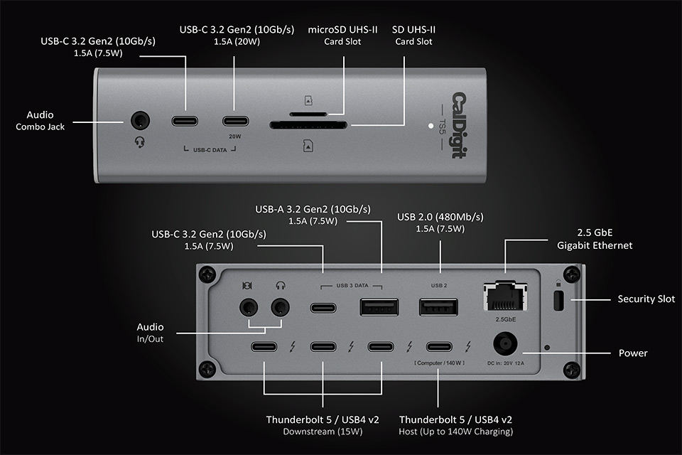 Højdepunkter:• Thunderbolt 5 dock med op til 120Gb/s• Understøttelse af op til tre eksterne skærme på Windows • 140W kraftfuld opladning til bærbare • 10 Gigabit Ethernet for ekstrem netværkshastighed • 20 samtidige porte til maksimal fleksibilitet • Dobbelte USB controllere for højere samlet båndbredde • UHS II SD og microSD kortlæser • Offline charging til telefoner og tablets En ny standard for professionel tilslutning:TS5 Plus sætter en ny benchmark for dock performance og workflow optimering takket være Thunderbolt 5 teknologien. Den giver op til 120Gb/s båndbredde til krævende opgaver og leverer hele 20 porte, der alle kan bruges samtidigt. Her får du en dock til både Mac og PC, som udvider din arbejdsstation uden kompromiser. Kombinationen af lynhurtig PCIe 64Gb/s, 10Gb/s USB porte og 10GbE netværk giver en samlet løsning, der matcher behovene hos professionelle brugere, kreative studier og tekniske workflows. TS5 Plus prioriterer stabilitet, høj ydeevne og fleksibilitet, så dine eksterne enheder altid arbejder optimalt.Kraftfuld opladning og forbedret USB performance:Med op til 140W power delivery kan TS5 Plus uden problemer forsyne selv de mest krævende laptops, såsom 16" MacBook Pro modeller med M3 eller M4 Pro og Max chips. Den indbyggede strømforsyning holder wattstyrken stabil, uanset hvor mange enheder du tilslutter. Derudover tilbyder de 10 USB porte hver 10Gb/s hastighed, og den frontvendte 36W USB C port giver ekstra kraft til tilbehør som tablets, iPads eller strømkrævende gadgets. De dobbelte USB controllere muliggør højere samlet båndbredde, hvilket er ideelt til brugere med flere eksterne SSD’er, audio interfaces eller andre high speed enheder.Fleksibilitet til skærme og høj opløsning:TS5 Plus tilbyder imponerende skærmmuligheder, herunder støtte for op til tre eksterne skærme på Windows Thunderbolt 5 systemer. Mac brugere får optimal støtte til enkelt eller dobbelt display afhængigt af deres chipsæt. Med DisplayPort 2.1 og kraftige Thunderbolt 5 porte åbnes der for høje refresh rates, 6K og 8K opsætninger samt båndbreddeforøgelse til grafiktunge workflows. Dockens Bandwidth Boost teknologi prioriterer skærmydelse til krævende monitorer, hvilket gør opsætningen ideel til designere, videoproducenter, ingeniører og gamere.Avancerede funktioner til professionelle workflows:Udover de kraftfulde porte er TS5 Plus udstyret med funktioner, der gør arbejdsdagen lettere. Den integrerede 10GbE port gør ekstern adapter overflødig og giver markant hurtigere filoverførsel over netværk. UHS II SD og microSD kortlæsere på fronten gør det nemt for fotografer og videofolk at importere data. Offline charging giver mulighed for at oplade enheder, selv når docken ikke er tilsluttet en computer. Og takket være den bagvendte host port får du ryddelig kabelstyring uden rodet på skrivebordet. Dette er en fuldblods dock designet til seriøse workflows, hvor performance og stabilitet er altafgørende.Specifications:• 1 x Thunderbolt 5 host port op til 120Gb/s• 2 x Thunderbolt 5 downstream porte 80Gb/s • 5 x USB C porte 10Gb/s • 5 x USB A porte 10Gb/s • DisplayPort 2.1 • SD 4.0 UHS II og microSD 4.0 UHS II • 10 Gigabit Ethernet • Front combo audio in/out 3.5mm • Rear audio out og audio in 3.5mm • Power delivery: Op til 140W • Understøttede systemer: macOS 15+, Windows 11+, iPadOS med Thunderbolt • Mål: 155 × 47 × 127.9mm • Vægt: 0.90kg • Inkluderet: TS5 Plus, TB5 kabel 1m, strømforsyning 330W, gummifødder, strømkabel Produktanmeldelser og links