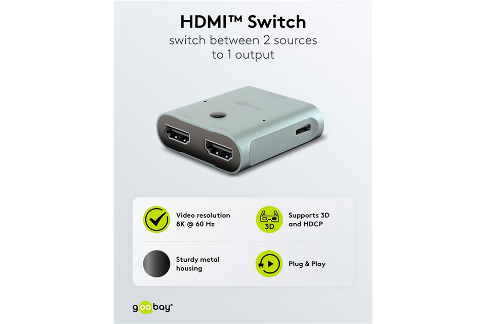 Højdepunkter:• Tilslut to HDMI enheder til én skærm• Understøtter op til 8K ved 60 Hz for ultraskarp billedkvalitet • Nem skift via fysisk trykknap • Mindsker slid på kabler og HDMI stik • USB C strømforsyning for stabil drift Smart HDMI switching gjort enkelt:Denne HDMI switch 2 til 1 er den perfekte løsning, når dit TV, din skærm eller projektor kun har én HDMI indgang, men du ønsker at tilslutte flere enheder. Med mulighed for at forbinde to HDMI kilder som spillekonsol, bærbar computer eller Blu ray afspiller, kan du nemt skifte mellem dem med et enkelt tryk på knappen. Det eliminerer behovet for konstant at tilslutte og frakoble kabler, hvilket både sparer tid og beskytter HDMI portene på dit udstyr. Det kompakte og stilrene design gør HDMI switchen velegnet til både hjemmebiograf, gaming setup og kontormiljøer, hvor stabil signaloverførsel og brugervenlighed er i fokus.Klar til moderne opløsninger og lydformater:HDMI switchen understøtter opløsninger helt op til 8K ved 60 Hz og leverer imponerende detaljer og skarphed i Full UHD kvalitet. Den er kompatibel med 3D indhold og HDCP, hvilket sikrer problemfri brug sammen med moderne streaming enheder og konsoller. Avancerede lydformater som Dolby Atmos, Dolby TrueHD, DTS HD samt ARC og eARC er fuldt understøttet, så du får en omsluttende og kraftfuld lydoplevelse, når den anvendes med kompatibelt udstyr. Strøm til enheden leveres via USB C tilslutningen, som sikrer stabil og effektiv drift uden behov for separate strømforsyninger.Specifications:• Indgange: 2 x HDMI hun Type A• Udgang: 1 x HDMI hun Type A • Maksimal opløsning: 8K ved 60 Hz 7680 x 4320 • Lydunderstøttelse: Dolby Atmos, Dolby TrueHD, DTS HD, LPCM, Stereo, ARC, eARC • Strømforsyning: USB C 5 V DC • Signalretning: Bi directional • Farve: Sølv • Dimensioner: 46 x 42,9 x 15 mm • Vægt: 30 g • Driftstemperatur: 0 til 40 grader C Produktanmeldelser og links