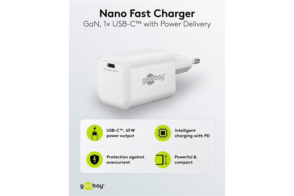 Højdepunkter:• Kraftfuld 65 W USB-C Power Delivery opladning• GaN teknologi for høj effektivitet og kompakt størrelse • Velegnet til både smartphones, tablets og laptops • Hurtig opladning med flere spændingsniveauer • Perfekt til både hjemmet, kontoret og rejsebrug • Universel kompatibilitet med mange populære enheder Kompakt og kraftfuld USB-C PD oplader:Denne USB-C PD GaN hurtigoplader kombinerer høj ydeevne med et ekstremt kompakt design, hvilket gør den ideel som både hjemmeoplader og rejseoplader. Med en maksimal effekt på hele 65 W kan den uden problemer oplade alt fra trådløse høretelefoner og smartphones til tablets og kraftige bærbare computere. Den alsidige USB-C Power Delivery port sikrer intelligent strømtilpasning, så hver enhed modtager præcis den mængde strøm, den har brug for. Resultatet er hurtigere opladning, højere effektivitet og optimal beskyttelse af dine enheder. Den lille størrelse gør opladeren nem at have med i tasken, uden at gå på kompromis med ydelsen.Avanceret GaN teknologi og bred kompatibilitet:Takket være moderne GaN teknologi opnås markant højere energieffektivitet sammenlignet med traditionelle opladere. Det betyder mindre varmeudvikling, lavere energitab og et mere kompakt og let design. USB-C opladeren understøtter flere spændingsniveauer og kan levere op til 3.25 A ved 20 V, hvilket gør den velegnet til opladning af laptops som MacBook samt hurtigopladning af smartphones via USB-C PD. Opladeren er kompatibel med et bredt udvalg af enheder fra producenter som Apple, Samsung, Xiaomi, LG, Huawei, Acer, HP, Fujitsu og Razer, hvilket gør den til en fleksibel og fremtidssikret opladningsløsning.Specifications:• Tilslutning indgang: Europlug Type C CEE 7/16• Tilslutning udgang: USB-C socket • Maksimal effekt: 65 W • Opladningsteknologi: USB-C Power Delivery • Udgangsspændinger: 5.0 V 3.0 A, 9.0 V 3.0 A, 12.0 V 3.0 A, 15.0 V 3.0 A, 20.0 V 3.25 A • Indgangsspænding: 110 - 240 V AC • Antal udgange: 1 • Materiale: ABS • Certificeringer: CE, WEEE • Anvendelse: Indendørs brug • Dimensioner: 88 x 36 x 36 mm • Vægt: 115 g • Pakning: Retail box Producent beskrivelse - Goobay
