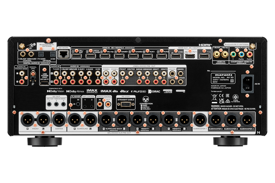Højdepunkter:• 11.4-kanals balanceret AV forforstærker til high-end hjemmebiograf• Understøtter Dolby Atmos, DTS:X Pro, IMAX Enhanced og AURO-3D • Syv HDMI-indgange med fuld 8K Ultra HD kompatibilitet og eARC • HEOS streaming med multiroom og high-resolution musik • Avanceret rumkorrektion med Dirac Live(licens) og Audyssey MultEQ XT32 ogmulighed • Fire uafhængige subwoofer udgange for præcis basstyring • Japansk håndværk med Marantz HDAM diskret kredsløbsteknologi • Balancerede XLR og RCA pre-out til eksterne effektforstærkere Referenceydelse til seriøse hjemmebiografer:Denne avancerede AV forforstærker er udviklet til entusiaster, der ønsker maksimal kontrol, fleksibilitet og lydkvalitet i store hjemmebiografer og dedikerede mediarum. Med 11.4-kanals signalbehandling åbnes der for en lang række højttaler og højtaler konfigurationer, herunder opsætninger op til 7.4.4, hvor fire subwoofere kan styres individuelt for optimal basintegration. Den balancerede signalvej med både XLR og RCA udgange sikrer ekstrem lav støj og høj dynamisk spændvidde, hvilket giver eksterne effektforstærkere de bedst mulige arbejdsbetingelser. Marantz HDAM-SA2 kredsløb bidrager til en hurtig respons og lav forvrængning, hvilket resulterer i en naturlig, detaljeret og musikalsk gengivelse, som løfter både film og musik til et markant højere niveau.Omsluttende 3D-lyd med præcision og dybde:Understøttelsen af Dolby Atmos, DTS:X Pro, IMAX Enhanced og AURO-3D giver en fuldt tredimensionel lydoplevelse, hvor lyde bevæger sig frit og præcist rundt i rummet. Dialog står knivskarpt i centerkanalen, mens effekter og ambience placeres nøjagtigt i både højde og bredde. Den avancerede signalbehandling gør det muligt at skabe et sammenhængende og realistisk lydbillede, uanset om du ser storfilm, koncertoptagelser eller spiller spil. Kombinationen af kraftfuld processering og Marantz Sound Master tuning sikrer en varm, rig og engagerende klang, der forbliver behagelig selv ved høje lydniveauer.8K video, intelligent streaming og avanceret rumkorrektion:Med syv HDMI-indgange og tre HDMI-udgange er systemet klar til nutidens og fremtidens videokilder. Alle HDMI-indgange understøtter 8K Ultra HD, 4K 120 Hz, HDR10+, Dolby Vision og dynamisk HDR, hvilket gør integration med moderne TV, projektorer og spillekonsoller enkel og fremtidssikret. HEOS platformen giver adgang til trådløs musikstreaming i høj opløsning samt multiroom funktionalitet, så musikken kan følge dig i hele hjemmet. Audyssey MultEQ XT32 analyserer og tilpasser lyden præcist til rummet, mens mulighed for Dirac Live RC,BC og ART (licens skal tilkøbes) giver ultimativ detaljeret rumkontrol, basstyring og optimal timing for den kompromisløse bruger.Specifications:• Type: 11.4-kanals AV forforstærker• Maksimal signalbehandling: 11.4 kanaler • Lydformater: Dolby Atmos, DTS:X Pro, IMAX Enhanced, AURO-3D • HDMI indgange: 7 x HDMI 2.1 • HDMI udgange: 3 inklusiv eARC • Video understøttelse: 8K 60 Hz, 4K 120 Hz, HDR10+, Dolby Vision • Pre-out: 11.4 x RCA og 11.4 x XLR • Subwoofer udgange: 4 uafhængige • Rumkorrektion: Audyssey MultEQ XT32, Dirac Live opgraderbar • Streaming: HEOS, AirPlay 2, Bluetooth, Spotify, TIDAL, Qobuz • Netværk: Wi-Fi, Ethernet • Multiroom zoner: Op til 3 • USB: Front USB og USB audio • Strømforbrug: 80 W • Vægt: 24.5 lbs • Fremstillet i: Japan Produktanmeldelser og links
