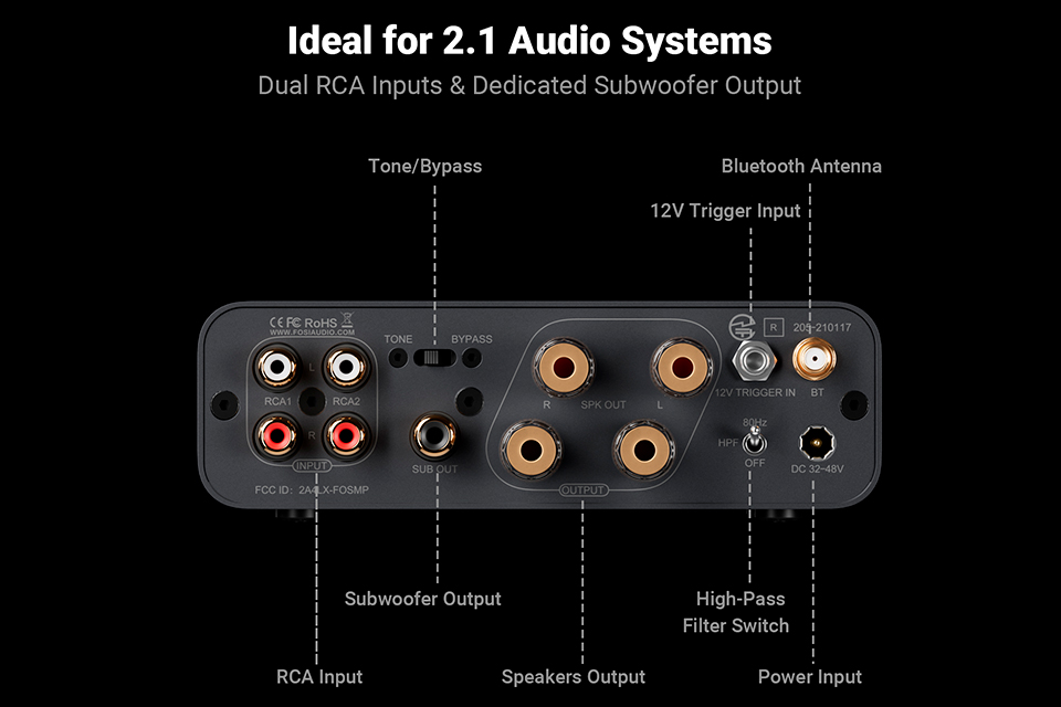 Kraftfuld Bluetooth 6.0 stereo forstærker med hi-res lyd. Understøtter aptX og LDAC, 2.1 opsætning med subwoofer og præcis lydkontrol i kompakt design.