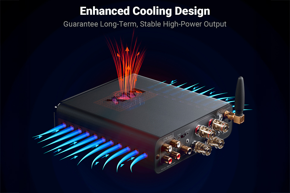 Forstærkeren er bygget omkring den kraftfulde TI TPA3255 forstærkerchip og NE5532 opamps, som tilsammen leverer op til 300 W x 2 ved 4 Ohm. Et forbedret kølesystem med indbygget lydsvag blæser øger køleeffektiviteten markant og sikrer stabil drift, selv ved høj belastning. Derudover understøtter BT20A Max bypass mode for helt ren signalvej samt 12 V trigger input, så den nemt kan integreres i større AV installationer. Alt i alt er dette en kompakt men ekstremt kapabel bluetooth forstærker, der kombinerer rå effekt, avanceret teknologi og fleksibel kontrol i én samlet løsning.