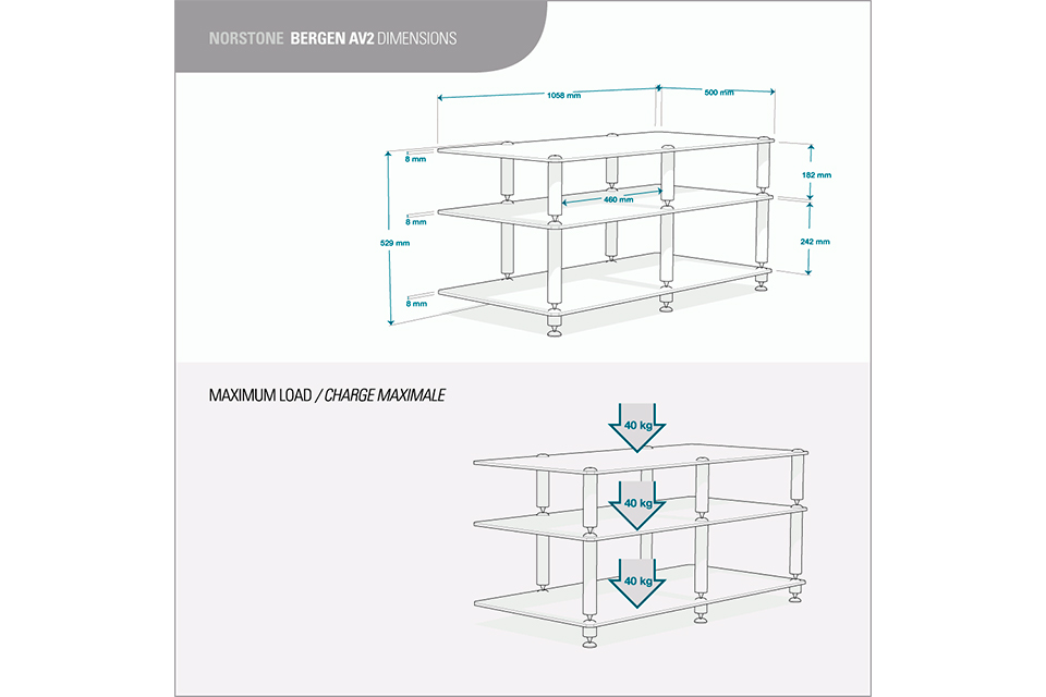 Højdepunkter:• Stort TV møbel og HiFi rack til audio og video udstyr• Tre rummelige hylder med høj bæreevne • Effektiv vibrationsdæmpning med spikes og afkoblingspunkter • Elegant finish i sort glas og sortlakeret stål • Optimeret højde til store fladskærms TV • Stabil konstruktion til forstærker, afspiller og andet HiFi udstyr Stilrent AV møbel til seriøs hjemmeunderholdning:NorStone Bergen AV 2 er et stort og solidt TV møbel og HiFi rack, designet til både fladskærms TV og avancerede audio og video installationer. Møblet giver rigelig plads til forstærker, DVD afspiller, Blu ray afspiller, streamer og andet AV udstyr, samtidig med at designet fremstår elegant og moderne. Den optimerede højde gør det ideelt som base for store TV, hvor skærmen placeres i en behagelig synshøjde. Kombinationen af sortlakeret stål og sortlakeret hærdet glas giver et eksklusivt udtryk, der passer perfekt ind i både moderne og klassiske indretninger. Bergen AV 2 er skabt til brugere, der ønsker et funktionelt HiFi møbel uden at gå på kompromis med æstetikken.Stabil konstruktion og effektiv vibrationskontrol:Hylderne i NorStone Bergen AV 2 er monteret på solide søjler, som står på spikes for at minimere vibrationer og uønskede resonanser. Denne opbygning sikrer optimale arbejdsforhold for følsomt HiFi og AV udstyr, hvor selv små vibrationer kan påvirke lyd og billede. De medfølgende fødder øger møblets samlede stivhed og stabilitet, mens hvert niveau har sit eget system af afkoblingspunkter. Alle hylder, inklusive den nederste, kan bære op til 40 kg, hvilket gør møblet velegnet til tunge forstærkere og kraftigt udstyr. Velcro kabelbindere gør det nemt at holde styr på kablerne, så installationen fremstår ryddelig og professionel.Specifications:• Type: TV møbel og HiFi rack• Antal hylder: 3 • Maks belastning pr. hylde: 40 kg • Konstruktion: Sortlakeret pulverlakeret stål • Hylder: Sortlakeret hærdet glas • Afkobling: Spikes og separate afkoblingspunkter • Medfølgende tilbehør: Velcro kabelbindere, spikes og fødder • Finish: Sort højglans og sort glas Produktanmeldelser og links