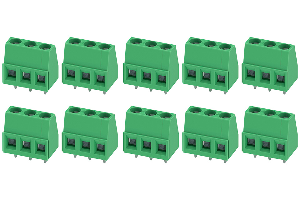 Kompakt 3-polet printklemme til PCB montering. Sikker og stabil ledningsforbindelse med 5,08 mm raster, høj strømkapacitet og robust, flammehæmmende hus.