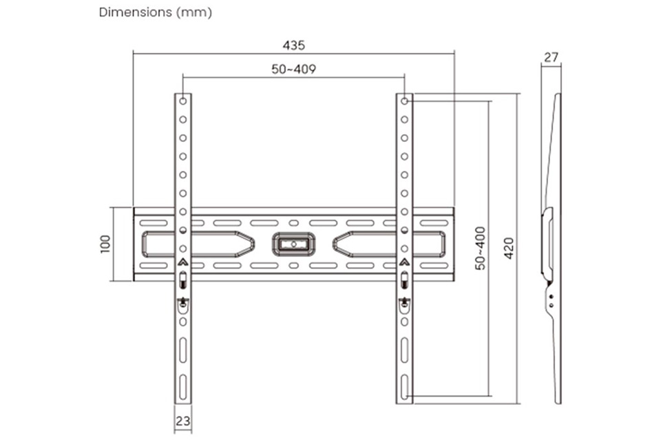 Højdepunkter:• Fast TV vægbeslag til 32 til 75 tommer fladskærme• Ultra-slankt design med kun 2,7 cm afstand til væggen • Maksimal belastning op til 45 kg • Nem montering i to enkle trin • Indbygget vaterpas for præcis justering • Fleksibel sidejustering efter montering • Understøtter VESA op til 400x400 mm Stilrent og pladsbesparende TV vægbeslag:Opgrader din stue og giv dit TV den placering, det fortjener, med dette faste TV vægbeslag i størrelse L. Beslaget er designet til fladskærme og curved TV fra 32 til 75 tommer og giver et elegant, moderne udtryk takket være den ekstremt lave afstand på kun 2,7 cm fra væggen. Det ultra-flade design gør vægbeslaget ideelt til slanke TV og sikrer, at skærmen nærmest svæver på væggen. Perfekt til dig, der har en fast siddeposition og foretrækker en stabil og uændret betragtningsvinkel, når du ser film, serier eller sport. Med en maksimal belastning på 45 kg er beslaget både solidt og sikkert og passer til langt de fleste TV-modeller på markedet.Nem installation og bred kompatibilitet:Monteringen er gjort enkel og overskuelig, selv for dig uden stor erfaring. Installation sker i to trin, hvor monteringsskinnerne først fastgøres på TV’et og derefter hægtes direkte på vægbeslaget. Det indbyggede vaterpas hjælper dig med at opnå en helt lige opsætning, mens den fleksible sidejustering gør det muligt at justere TV’et til venstre eller højre, selv efter det er monteret. TV vægbeslaget understøtter VESA standard op til 400x400 mm og er kompatibelt med både fladskærme og curved TV fra populære mærker. Den robuste stålkonstruktion med pulverlakeret overflade sikrer lang holdbarhed og et diskret sort finish, der passer ind i enhver indretning.Specifications:• Beslagstype: Fast TV vægbeslag• Skærmstørrelse: 32 til 75 tommer • Maksimal belastning: 45 kg • Afstand til væg: 27 mm • VESA kompatibilitet: Op til 400x400 mm • Understøttede VESA mål: 75x75 mm til 400x400 mm • Materiale: Pulverlakeret stål • Farve: Sort • Bredde: 435 mm • Højde: 420 mm • Dybde: 27 mm • Vægt: 910 g • Monteringstilbehør: Dyvler og skruer Produktanmeldelser og links