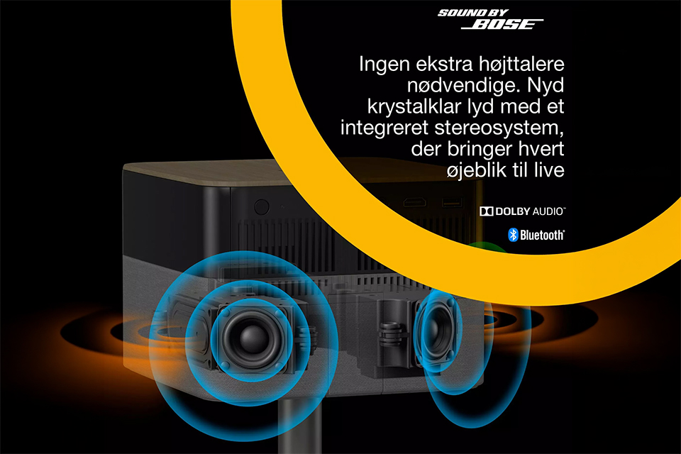 Bærbar 4K PRO-UHD projektor med 1.000 lumen, Sound by Bose og Google TV. Op til 150 tommer billede, auto opsætning og fleksibel 180° rotation.