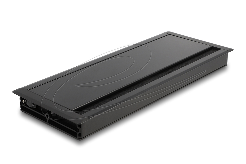 Kabelgennemføring til bord med hængslet låg og børste. Elegant løsning i sort aluminium til sikker, støvbeskyttet og ryddelig kabelføring.